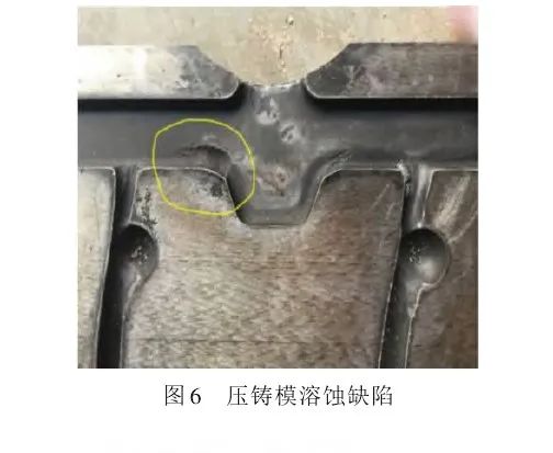 溶蚀缺陷一般出现在采用活泼合金压铸的模具上,如Zn、Al、Mg等。溶蚀缺陷既有化学作用,也有物理作用,介于腐蚀与冲蚀之间。溶蚀缺陷仅出现在受到熔融金属液直接冲击的部位,即模具的型芯、型腔表面或硬度偏软处,压铸模溶蚀缺陷如图6所示。