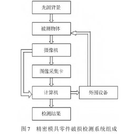 以下介绍3种基于机器视觉技术的模具检测系统。(1)精密模具零件破损检测系统。传统的精密模具零件检测方式有人工检测及高斯曲线拟合检测等技术。人工检测劳动强度大、成本高、检测准确率低,有时检测使用的工具可能损伤模具零件表面。针对这个问题,谢俐等设计了一种精密模具零件缺陷检测系统,该系统主要包括模具零件图像采集、模具零件图像处理、模具零件检测结果输出以及显示等操作过程,具体组成结构如图7所示。