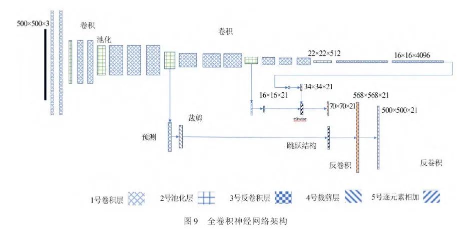 全卷积神经网络架构如图9所示。在图9中,1号图例代表卷积层,2号图例代表池化层,3号图例代表反卷积层;FCN中的跳跃结构表示为带箭头的线段所引出的过程;4号图例代表剪裁层,用途是统一尺寸;5号图例代表逐元素相加,目的是融合结果。