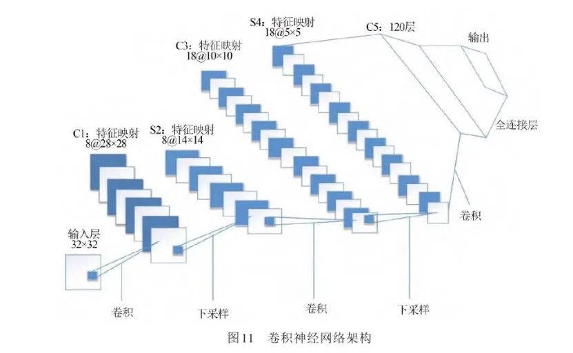 (3)采用CNN算法对缺陷进行分类。卷积神经网络是以人类神经元工作模式为理念所设计的一种网络结构,该网络共有5层,按顺序排列为输入层、卷积层、池化层、全连接层和输出层。其中,输入输出层用来接收与输出数据;卷积层、池化层以及全连接层为主要的工作层,对数据进行处理而获得想要的结果。卷积神经网络的架构如图11所示。
