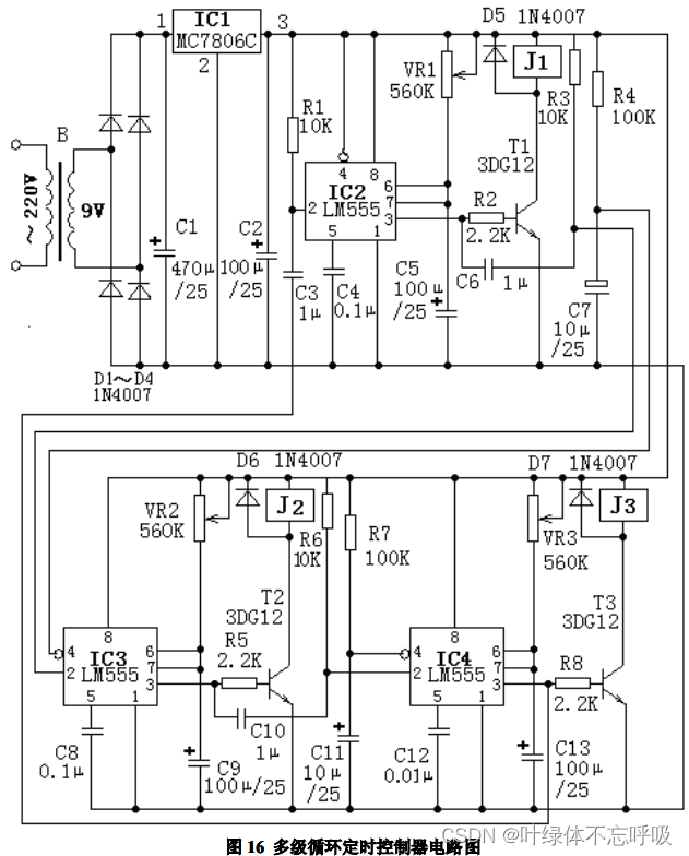 电路中,由三个时基集成电路LM555组成三个单稳态电路,每个单稳态电路作为一个定时控制单元。三个单元共同完成三级循环定时控制功能。