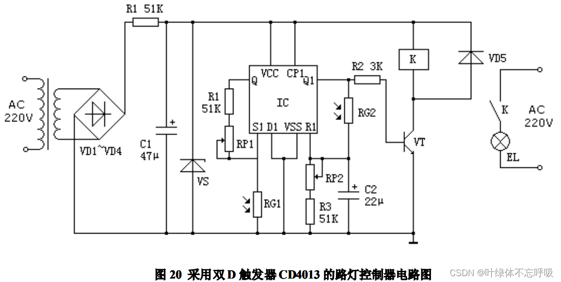 天亮后,RG1和RG2阻值下降,IC的Q1端又输出低电平,VT截止,K释放,EL熄灭。