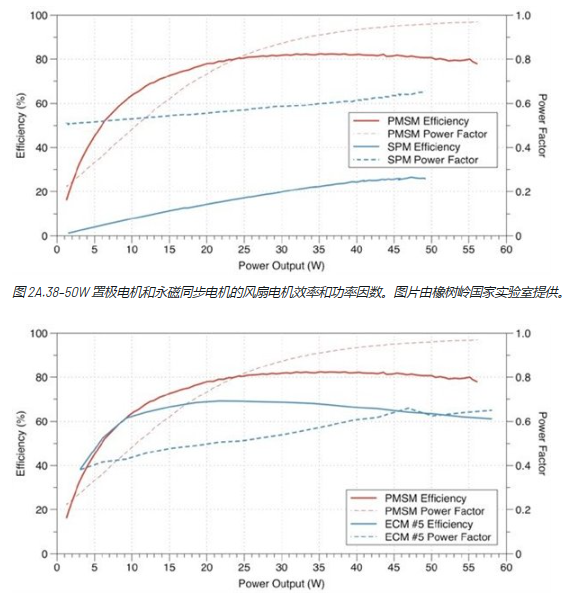 图 2B.38–50W ECM 和 PMSM 电机的风扇电机效率和功率因数。图片由橡树岭国家实验室提供。