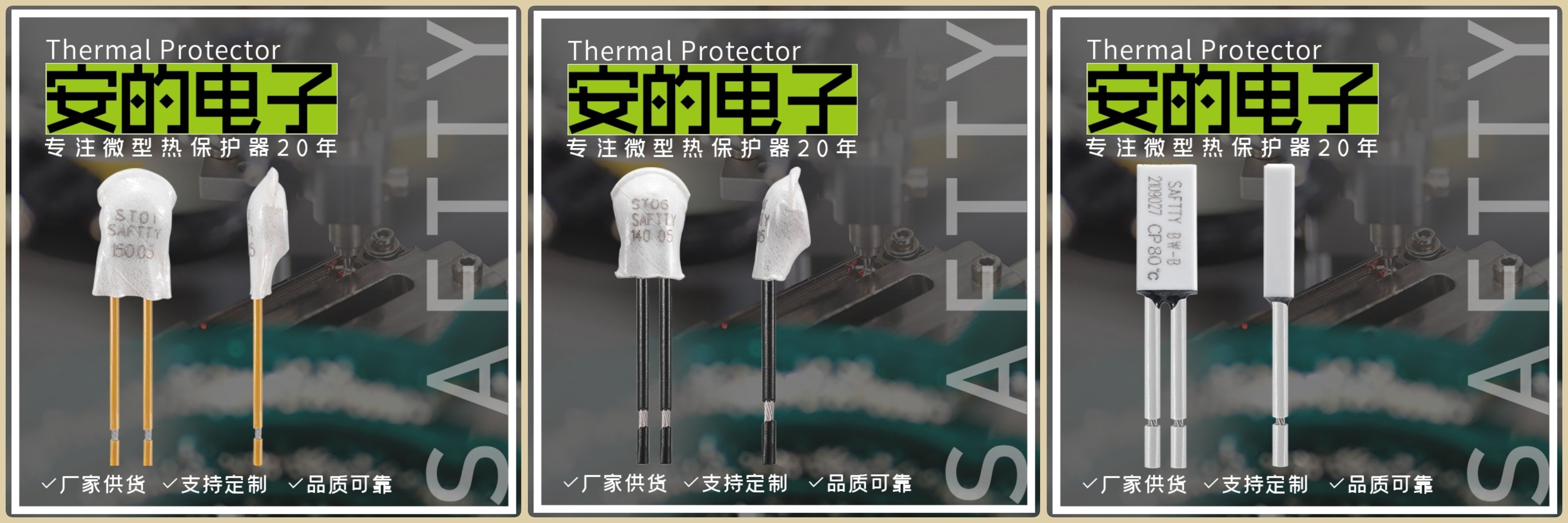 我司安的电子(SAFTTY),从2008创立于广州,专业研发&生产&销售各类微型热保护器、温度开关、温控开关。在开关电源、风机、水泵、油烟机电机、管状电机、工业电机、变压器、电抗器、逆变器、电伴热、直发器、医疗设备等细分应用市场,名声远扬,有较高的市场占有率。我司70%的产品远销欧美,并与国际专业大客户深入合作。