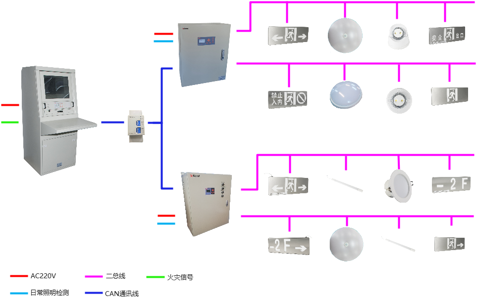 消防应急照明与疏散指示系统由控制器(主机)、集中电源和灯具(疏散指示灯具、应急照明灯具)等几部分组成。因本项目产品过多,此处只介绍主要产品。