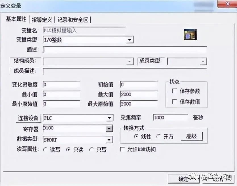 定义变量“PLC模拟量输入”,变量属性如图9-11所示。注:变量读写属性为“只读”。