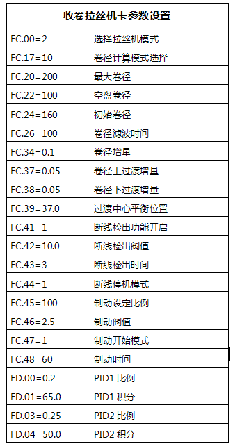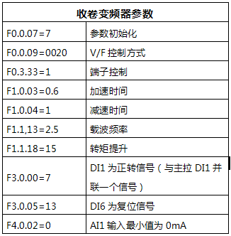 3.紧急停机不断线。可以通过配合主拉紧急停机的时间和收卷启动直流制动的频率来控制。例如紧急停机断线了,则需要增加主机的紧急停机时间或者适当调大直流制动的起始频率。