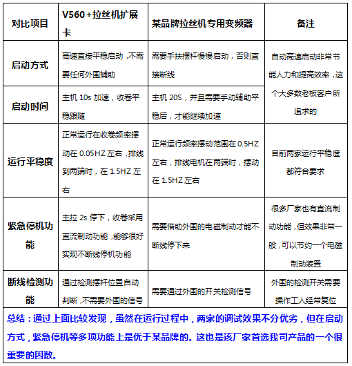 总结:通过上面比较发现,虽然在运行过程中,两家的调试效果不分优劣,但在启动方式,紧急停机等多项功能上是优于某品牌的。