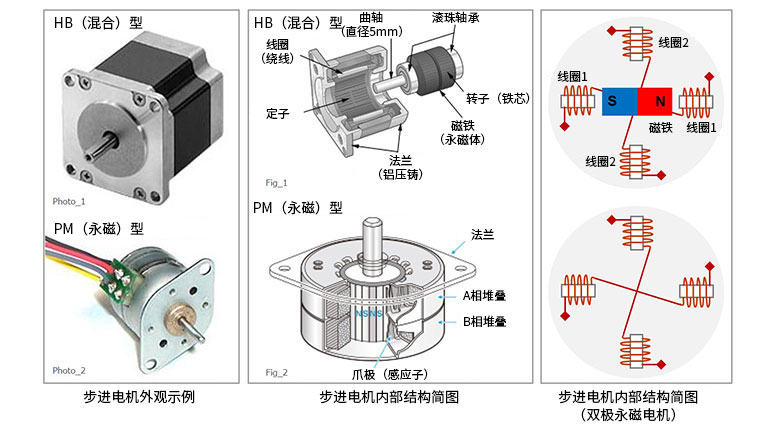 在外观示例中,给出的是HB(混合)型和PM(永磁)型步进电机的外观。在中间的结构图给出的也是HB型和PM型的结构。