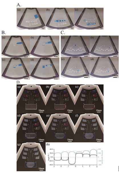 图2 基于偏转脉冲的微流控 微流控在应用中主要用到的功能包括溶液定量、可中断进液、流路选通、顺序进液。上述的四项基础功能的组合可实现大多数情况下的离心微流控芯片的操作需求,例如微流控芯片上的核酸检测、蛋白质检测等所需操作,其能有效地提高离心微流控芯片的工作效率和系统稳定性。研究团队用所设计平台实现传统微流控的功能(图3)。