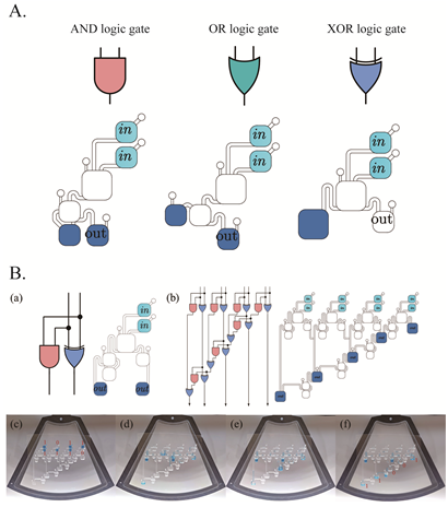 图3 实现传统微流控基础功能 在前文,研究团队所演示的功能更多是基于单进程的控制,针对如何依靠偏转角和偏转速度实现多进程的控制,研究团队展开了进一步研究。可变位姿微流控芯片在工作过程中能不断进行顺时针和逆时针的偏转,这令研究团队想到电路设计中的晶振元件为系统提供时钟信号,而离心力又与电源十分相似同样为系统提供动力,于是研究团队从逻辑电路角度去构思芯片设计,通常称之为逻辑门水路。通过对偏转脉冲的控制,研究团队实现逻辑液滴的加法器(图4),证明在离心微流控平台实现液滴逻辑控制的可行性。