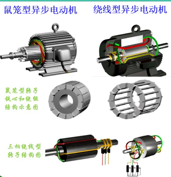 2、转子绕组:1)鼠笼式转子:转子铁心的每个槽内插入一根裸导条,形成一个多相对称短路绕组。2)绕线式转子:转子绕组为三相对称绕组,嵌放在转子铁心槽内。