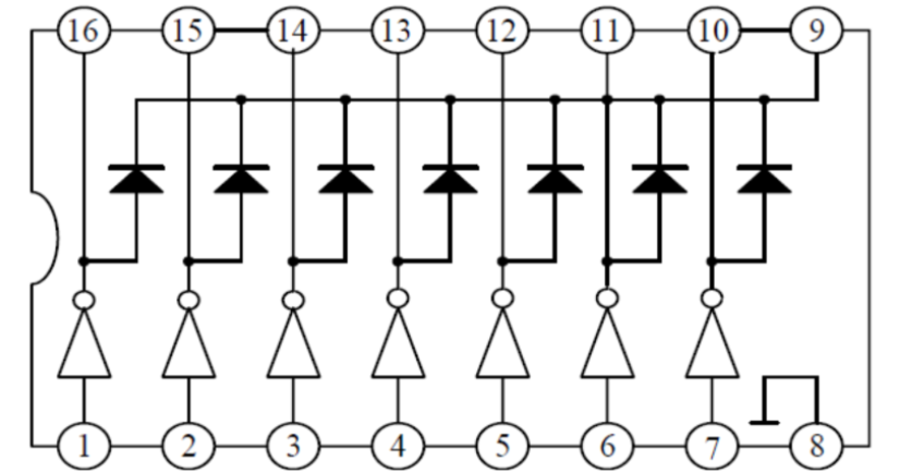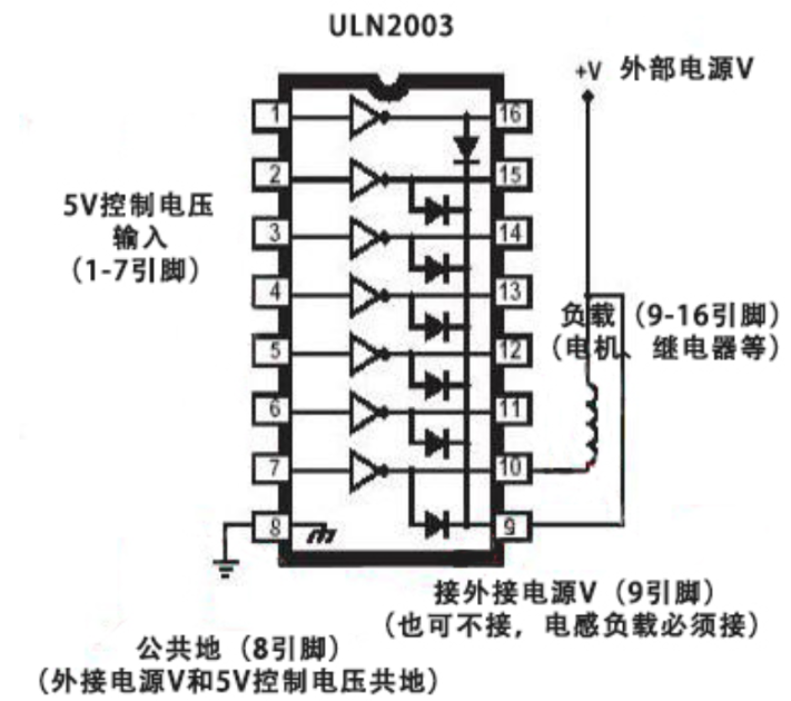 根据上面的原理,ULN2003的驱动应用电路的基本示例图,各个引脚的功能都标注在上面: