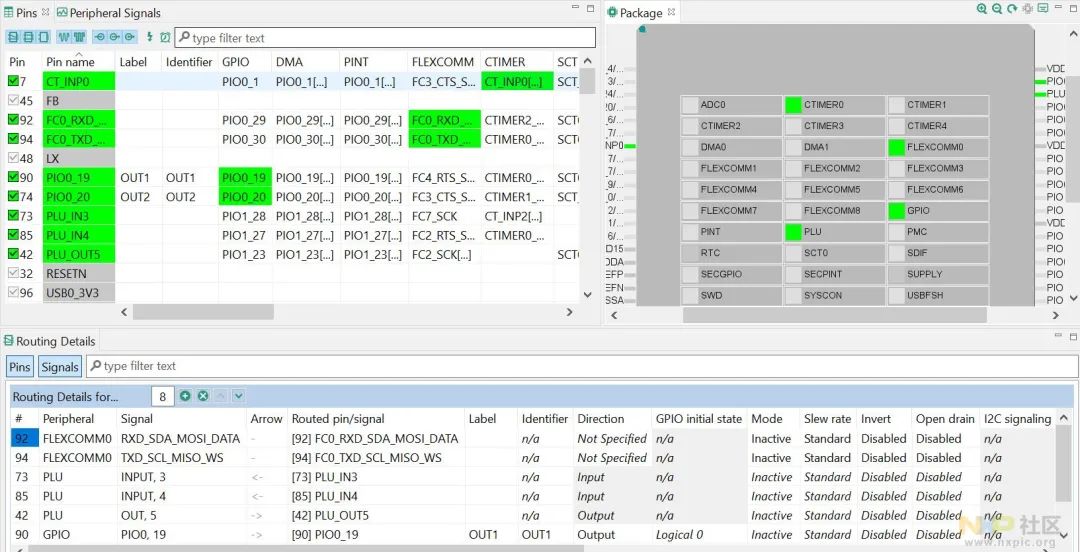 PLU(Programmable Logic Unit),即可编程逻辑单元,可创建小型组合与时序逻辑电路。LPC804与LPC55XX的PLU在使用上是完全相同的,包含了6个输入、8个输出、26个5输入查找表(LUT)、4个触发器(state Flip-Flops),详细介绍如下: https://www.nxpic.org.cn/module/forum/thread-622667-1-1.html 用PIO_19与PIO_20产生类似于正交编码信号,将两路信号输入PLU模块的IN3与IN4,进行异或运算,再输出到OUT5,将OUT5信号输入到CTIMER计数器进行计数,如下:
