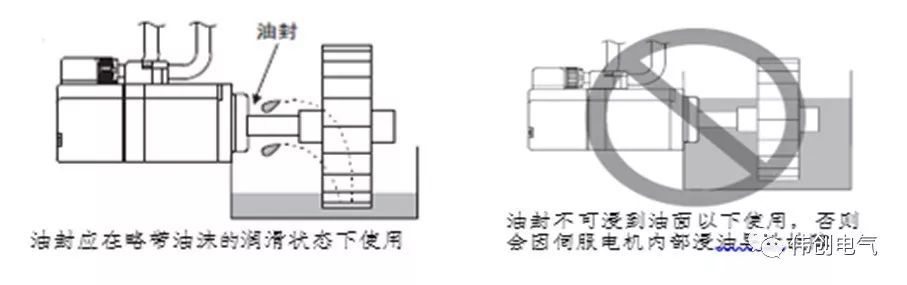 B. 如果伺服电机连接到一个减速齿轮,使用伺服电机时应当加油封,以防止减速齿轮的油进入伺服电机。 C. 在轴贯通部会被溅到油滴的环境中使用时,请选择带油封的伺服电机。如果不会被溅到油滴则可使用标准伺服电机。