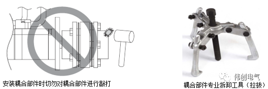 A. 在安装/拆卸耦合部件(联轴器、皮带轮、链轮等)到伺服电机轴端时,不要用锤子直接敲打轴端。(锤子直接敲打轴端,伺服电机轴另一端的编码器容易被敲坏),在拆卸伺服电机耦合部件时,对于比较难拆的耦合部件最好使用拉拔进行拆卸。