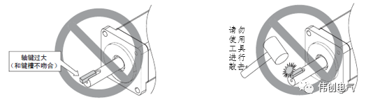 注:① 安装/拆卸耦合部件时,一定要注意对伺服电机编码器的保护 (编码器属于高精密产品,受到外部的震动及敲打之后,容易损坏) ② 电机轴与耦合部件安装比较困难时,请根据现场实际情况对电机轴表面或者耦合部件内径表面进行打磨,打磨好后加上润滑剂(黄油、机油)重新装配。 B. 轴键的安装请使用产品附带的轴键或符合使用说明书中所规定尺寸的轴键,安装与拆卸轴键时请勿使用工具进行强力敲击。
