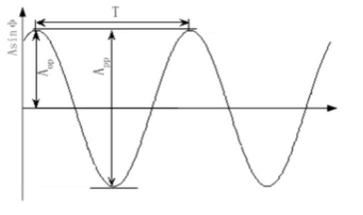 从前面的定义可以看出,振动的位移是振动中质点距离初始位置之间的距离。在整个时域中,振动的位置不断变化,每时每刻都有一个位移值。其中,质点距离初始位置最远的距离,对于机械设备来说,在整个振动所有位移值中,是影响最大的。同时对于一个振动而言,设备经历的最大变形量是两个峰值之间的距离,也就是这个振动位移量的峰峰值。在上图的振动波形中就是横轴两侧,振动幅值的绝对值之和。设备经历振动的最大变形量对设备自身的影响最大,因此在对振动进行位移值测量的时候,一般取峰峰值。