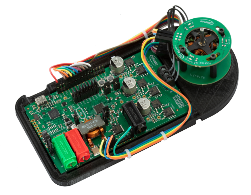 (XENSIV TLE4968-1L)电路以及三相无刷直流电机。所有组件都安装于3D打印的封装中,可随时用于评估。预置的示例代码涵盖最常见的电机控制算法类型,包括无传感器或带有霍尔和/或角度传感器,以及阻塞换向或磁场定向控制。这使得设计人员能够根据应用来比较和选择最合适的算法。