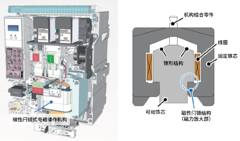 图1 低压空气断路器内部结构 图2 磁性闩锁式电磁操作机构
