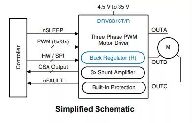 控制电路快速连接。该器件支持的最大PWM频率为200 kHz。DRV8316同样有着95mΩ的超低RDS(ON)(高侧和低侧相结合)。1.5µA的低功耗睡眠模式结合低导通电阻,既保证了低功耗又有着强大的驱动功率。