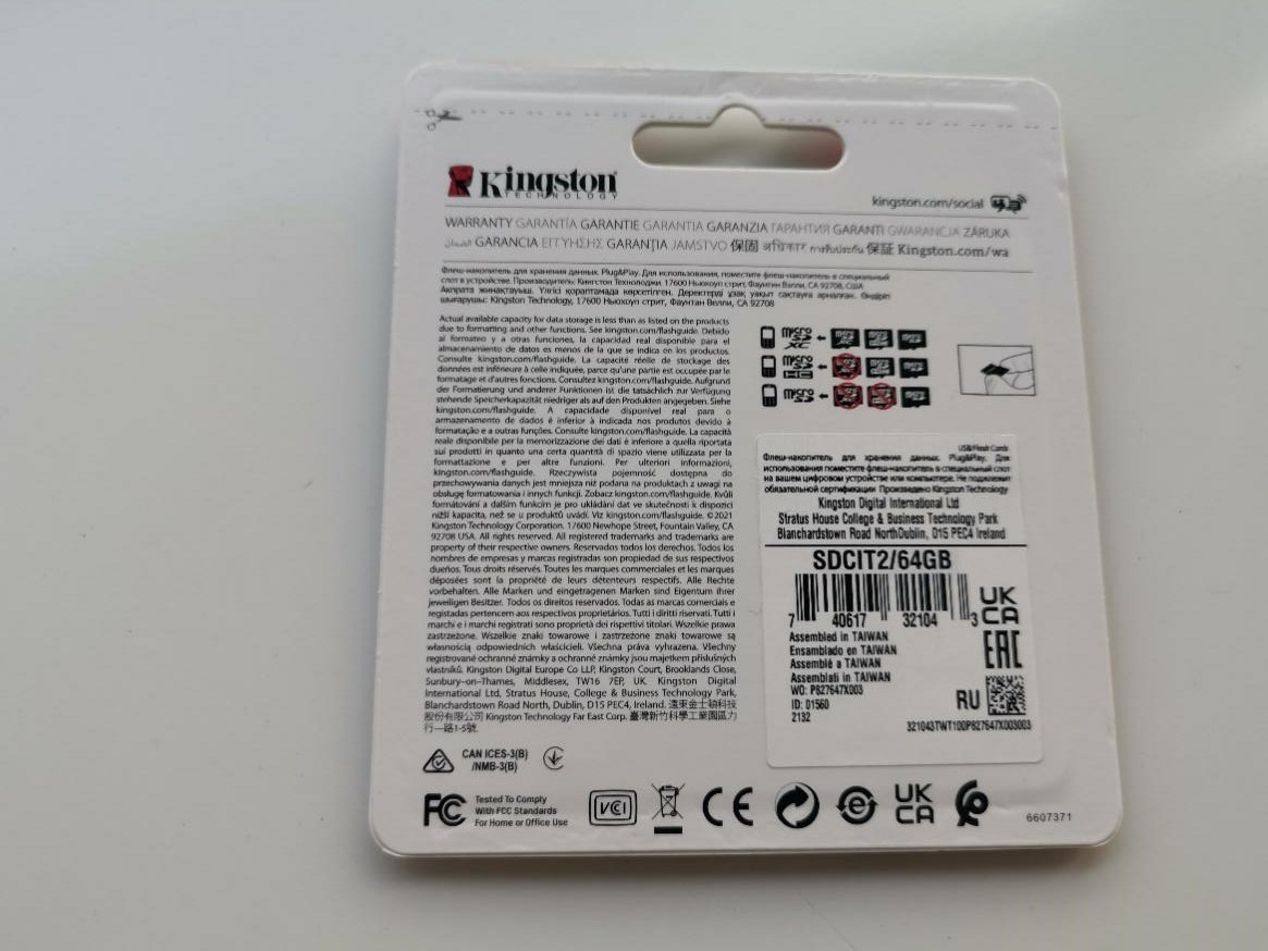 在包装盒的背面的信息有产品名、容量、产品序列号等信息。从背面的信息可以知道,此次我们开箱的产品名为SDCIT2,容量是64GB,是本次工业级microSD产品中容量最大的一款,更新后的金士顿工业级microSD卡有8GB、16GB、32GB、64GB四种不同容量可供选择。从包装盒上可以看出该卡是在台湾组装的。