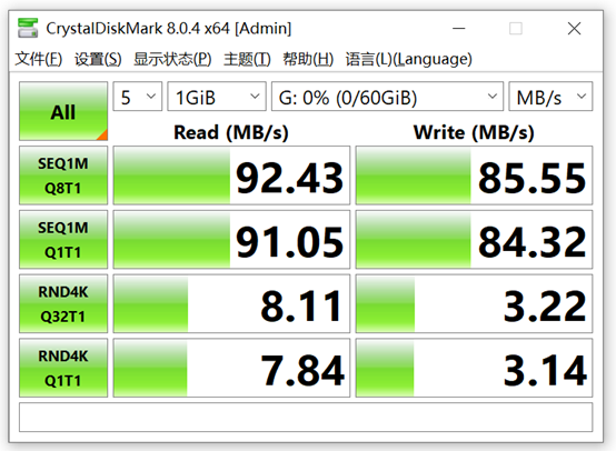 开箱完成后,我们来测试一下工业级microSD卡的性能,看看它能不能达到官方标定的数值。首先我们用的是CrystalDiskMark来进行了测试,我们选用了CrystalDiskMark最新的版本8.0.4 x64,我们总共测试了5次,采用了处于平均值附近的结果。