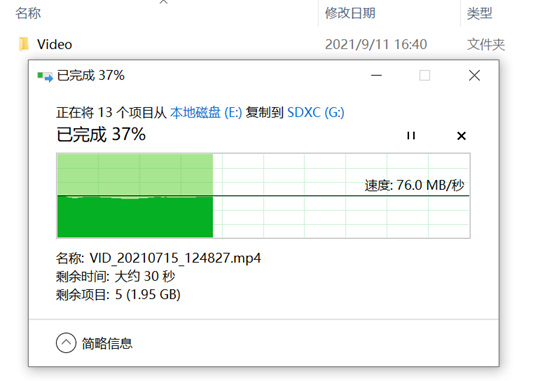 上面是用测试软件得到的结果,那如果直接拷贝文件进工业级microSD卡,实际的拷贝性能怎么样呢?我们也做了一个测试。可以清楚地看到实际的写入速度大概在76MB/s,与测试软件得到的数值85MB/s和81MB/s还有一些差距,但稳定性还不错。实际表现还算让人满意。