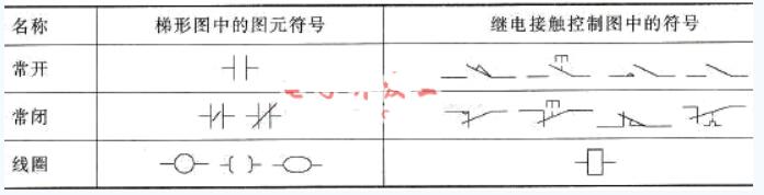 而且不同厂家对不同的元件地址分配范围和指令操作也是不一样的。所以看PLC梯形图要结合厂家的plc编程手册软元件功能结合。但是所有的PLC都有相似的功能:对输入输出的位、输入输出的模拟量,以及PLC内部系统用的位,数据存储区域的操作和地址分配。 梯形图中的图元符号是对继电接触控制图中的图形符号的简化和抽象,两者的对应关系如表所示。