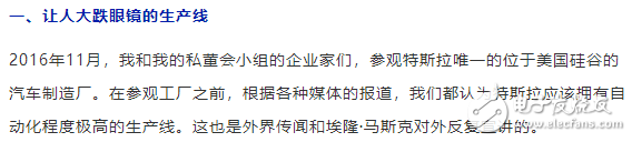 在与特斯拉高管对话时,我们也提出了这个问题,当年特斯拉 Model3的年产量只有5万辆,而他们预计两年后即2018年,要达到30万辆。我们对此提出了质疑:一条不够连续和自动化的生产线,要将产量从5万辆涨到30万辆,如何才能做到呢?
