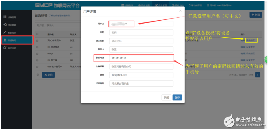 管理员账号创建完设备后,可以通过“普通账号”选项为用户创建一个单独的账号供其访问所属的设备。