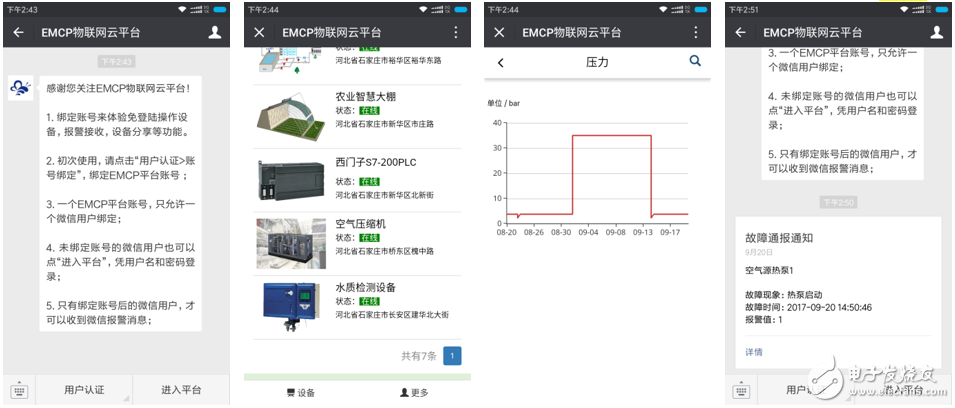 微信关注“EMCP物联网云平台”公众号,按照提示绑定平台账号,即可使用微信监控设备,接收报警信息。为了便于对设备的管理建议将“EMCP物联网云平台”公众号“置顶”。