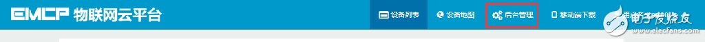 用管理员账号登录EMCP平台,对EMCP云平台进行设置。具体操作参照《EMCP物联网云平台用户手册》。登录EMCP后首先进入设备列表显示页面,因为我们未创建任何设备,所以是一个空页面。点击右上角的“后台管理”按钮(只有管理账号才有此权限),进入EMCP平台的后台。