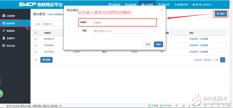 2输入模块SN,输入要绑定的SN码,如果此SN之前未绑定,则会弹出绑定窗口进行绑定;