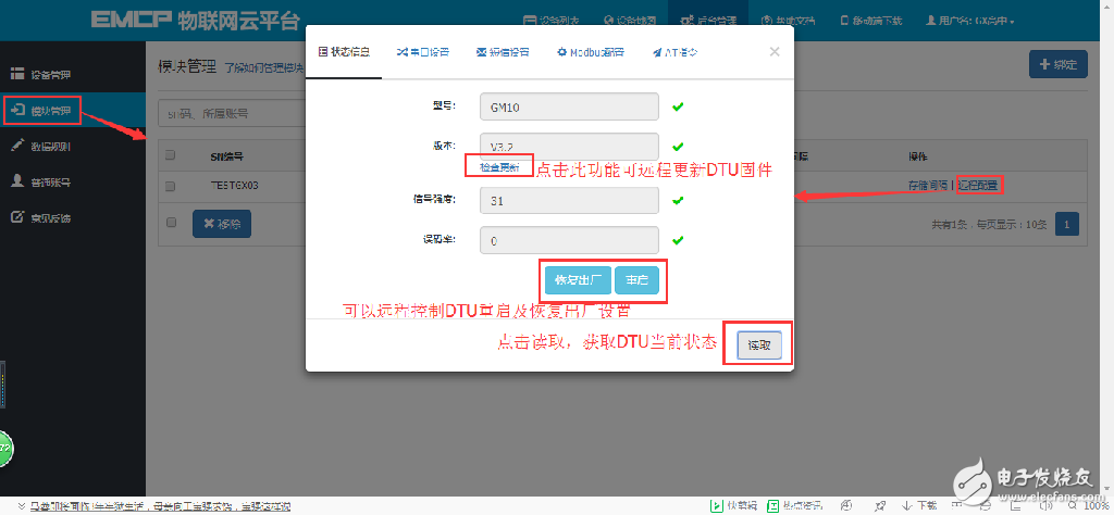 1.SN码和密码绑定错误,EMCP平台所建设备的SN码必须和所连GM10模块的SN码相同(SN位于GM10右侧面标签),密码必须和DTU配置软件设置的密码相同(默认111111)。