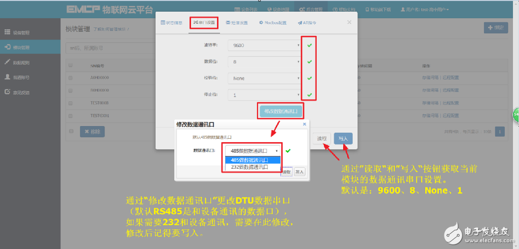 打开“后台管理—》模块管理”页面,将DTU绑定至此管理员账号,然后就可以使用“远程配置”功能来配置DTU的各项通讯参数和功能参数。最主要两个地方需要配置,一是与PLC通讯的串口参数,二是设置DTU定时采集PLC数据的MODBUS通道参数,下面分步骤对此功能进行讲解。注:模块只有在线后才可以进行远程配置,也可以使用“DTU配置软件”对模块配置,参考文档《DTU配置软件使用手册》。