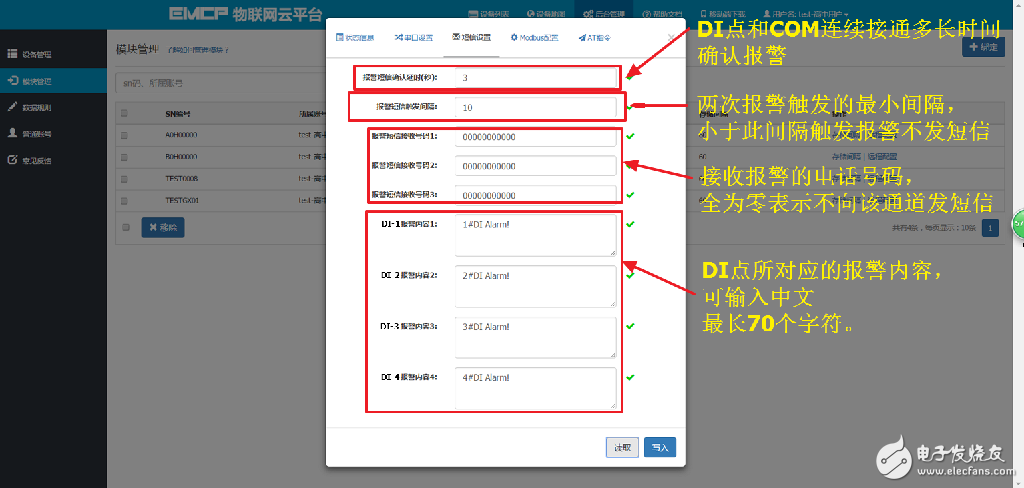 模块的远程配置最好先“读取”再“写入”,只有写入成功后才表示该参数成功配置到DTU中,“写入”后也可以“读取”以检查之前的操作是否成功。如果不用模块DI报警点则无需进行“短信设置”。