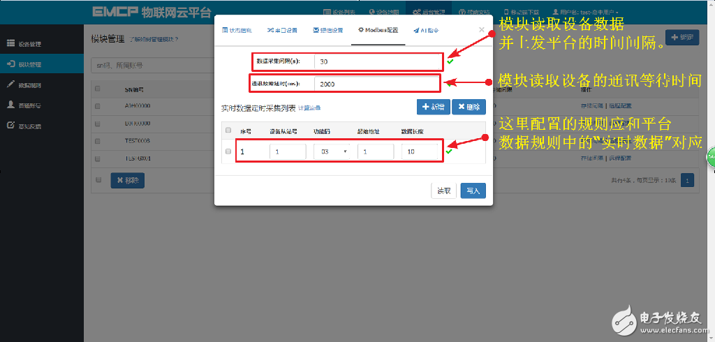 读写数据:无需在DTU配置Modbus定时采集通道,可直接通过平台对下位设备进行数据的手动读写操作;