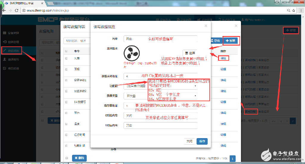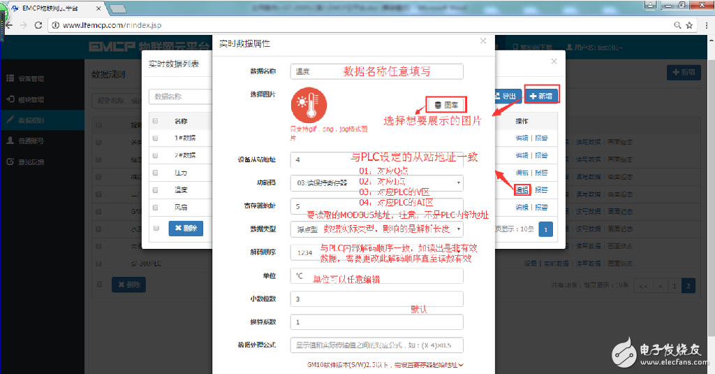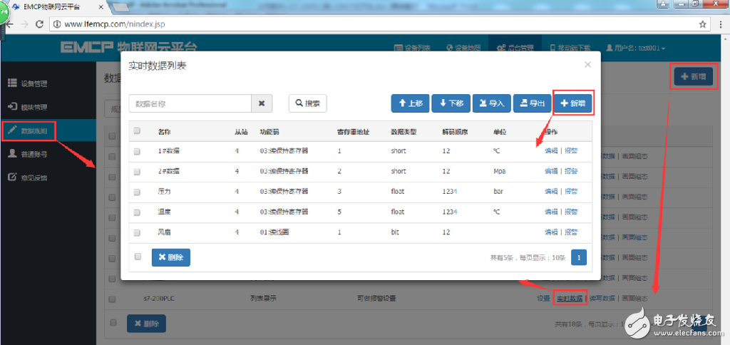 点击网页左侧的“数据规则”进入规则设置页面,点击右上角的“新增”,在弹出的窗口中设置该数据规则的名称“S7-200PLC”和展示样式“列表展示”,我们可以选择列表展示或组态展示,列表展示:我们所添加的数据会以固定的列表样式展示,列表展示方式简单方便(数据测试阶段可选用列表展示)。组态展示:我们可以任意绘制设备数据的展示样式比如添加图形、图片、仪表盘、柱状填充和文字等内容(此功能类似传统的组态软件可参考《EMCP平台画面组态使用说明》文档)。数据规则新建完后点击“实时数据”新增实时数据(3.1.2中设置的Modbus配置),点击“读写数据”创建平台对设备手动读写操作的数据。创建规则展示如下。