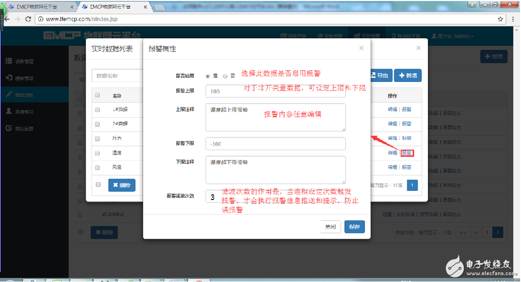 报警设置,在创建好的实时数据中,点击“报警”选项,进入报警设置页面。我们可以设定该数据的报警上下限和报警内容以及是否启用此报警。设定报警后当该数据超出报警上下限后平台会自动记录报警的时间和报警值,同时平台会向用户登录的APP或微信推送报警消息。