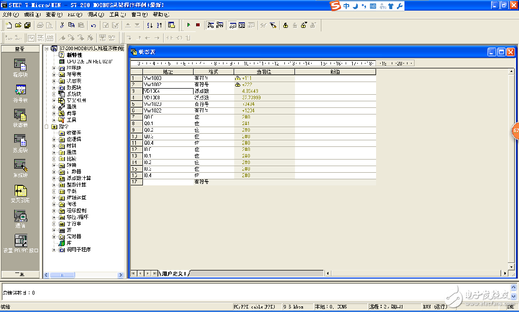 打开Step7-MicroWin 编程软件的“程序状态监控”和“状态表监控”,查看程序的运行状态和内部数据的数值显示。通过状态表我们可以查看各数据的当前值和对数据进行强制。如下图。