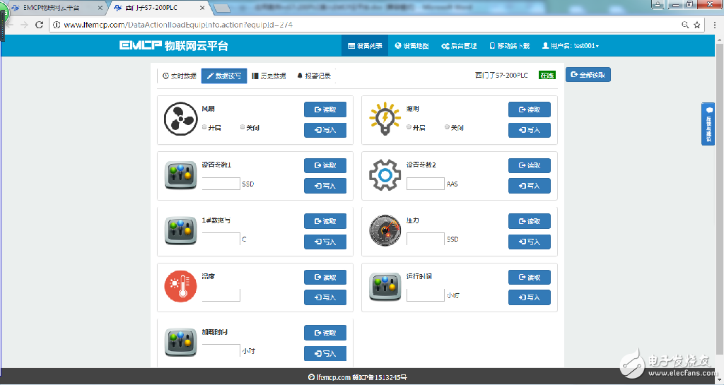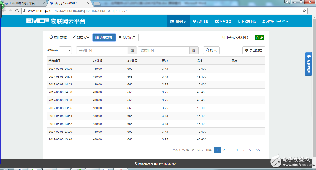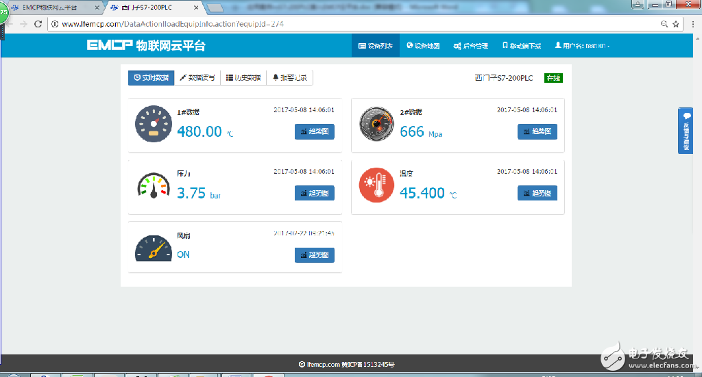 用户登录EMCP平台,点击 “西门子S7-200PLC”设备的图片或设备名称进入设备。首先看到的是200PLC定时采集数据的显示(实时数据),点击“读写数据”对200PLC进行读写操作,点击“历史数据”查看设备定时存储数据的历史数据报表,点击“报警记录”进入报警信息记录报表页面,显示如下。