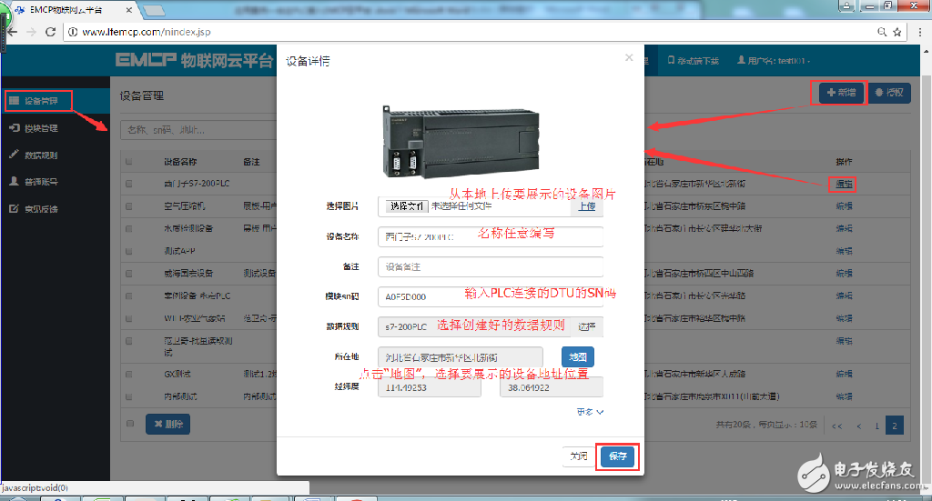 新建“设备”, 选择菜单“设备管理”-》 “新增”新建一个设备“西门子S7-200PLC”。新建设备是填写设备的基本信息,1选择设备匹配的图片(从本地上传,也可不选择,系统会以默认图片显示);
