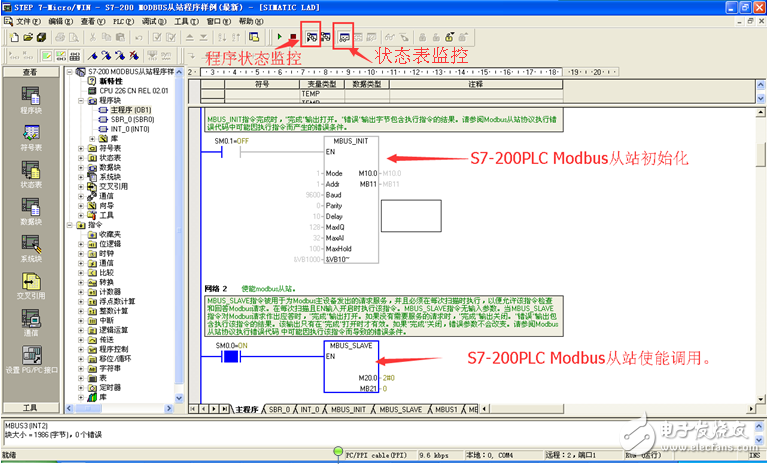 1,将200PLC经编程电脑连接到电脑上,打开Step7-MicroWin编程软件,新建工程,在主程序中添加Modbus Slave Port0功能块(MBUS_INIT,MBUS_SLAVE)