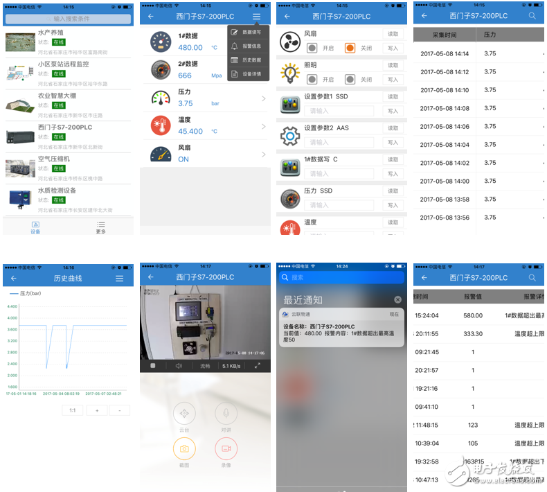 在手机安装《云联物通》手机APP(可通过电脑网页平台登录页右上角的二维码扫描下载,或各大应用商店下载),凭用户名和密码登录,进入设备列表后点击“西门子S7-200PLC”设备,直接进入的是实时数据列表页面或组态画面(组态展示方式下),点击右上角菜单栏“三杠按钮”,弹出功能菜单,在菜单中点击“读写数据”对读写数据进行读写操作,点击“历史报表”查看设备的历史存储数据报表,点击“历史曲线”可查看各数据的历史趋势图,点击 “报警信息”查看该设备的报警记录,点击“设备详情”查看设备的详细信息或视频画面。