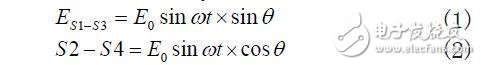 无论何种配置,旋变正弦绕组的输出电压是S1-S3,余弦绕组的输出电压是S2-S4,如(1)式和(2)式所示。其中:θ为轴角,ω为转子激励角频率,E0为转子激励幅度。