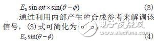 转换器跟踪轴角θ的原理为,转换器产生输出角φ,然后反馈φ以与输入角θ相比较。当转换器正确跟踪输入角度时,二者之间的误差将被驱动至0。为了测量误差,将(1)式乘以cosφ,(2)式乘以sinφ,其差值为: