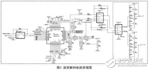 图3为旋变解码电路原理图。首先由AD2S1205解码芯片产生差分正弦励磁信号,经过运放放大、跟随后,通过推挽的方式输出到电机旋变。电机旋变返回的差分信号S1-S3、S2-S4,经IC26运算后送AD2S1205进行处理。SINLO和COSLO同时接入到REFOUT的目的是增强信号的稳定性,信号放大倍数为1.5。