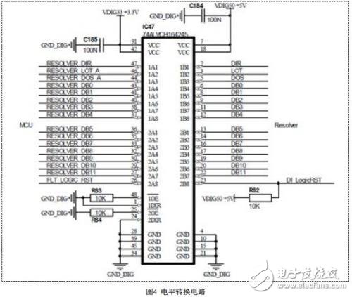 电平转换芯片采用74ALVCH164245,此芯片把旋变信号转为3.3V后送单片机,其电路如图4所示。