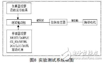 实验测试系统由测试驱动板,旋变和拖动电机组成,如图8所示。拖动电机旋转带动旋变运行于不同的转动角度和转动速度上,由解码电路输出励磁信号,驱动旋变,同时接收反馈的正、余弦信号,解析旋变的转动角度和转动速度。通过使用仿真器,在初始化函数的前后设置断点控制函数调试过程,并观察函数运行结果是否正确。通过示波器,观察函数运行后相关管脚上的驱动时序是否正确,并观测RESET/SAMPLE/LOT/DOS管脚。在初始化执行过程中,需参照复位时序观察MCU控制的RESET和SAMPLE管脚是否在对应时间送出对应电平或者脉冲,需观察如果系统硬件连接正常,DOS/LOT管脚是否在初始化后输出高电平指示,或者如果系统硬件连接不正常(比如旋变接线断路),DOS/LOT管脚是否在初始化后输出对应故障信号。
